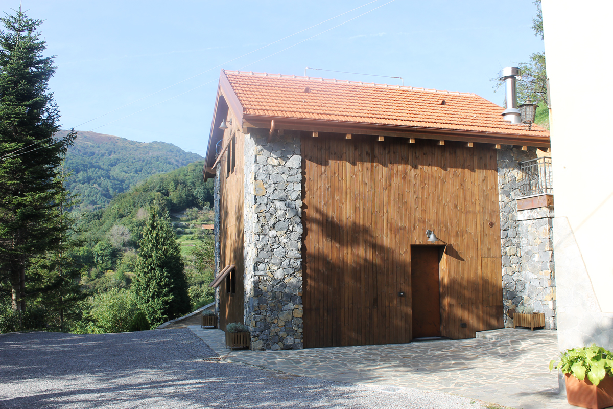Viene mantenuto all’esterno il carattere della struttura, grazie alla scelta di materiali come legno e pietre. A contrasto, nell’interno essenziale e di gusto moderno, elementi funzionali come la scala e le mensole, enfatizzati dal legno nero, diventano elemento decorativo nell’ambiente total white.
