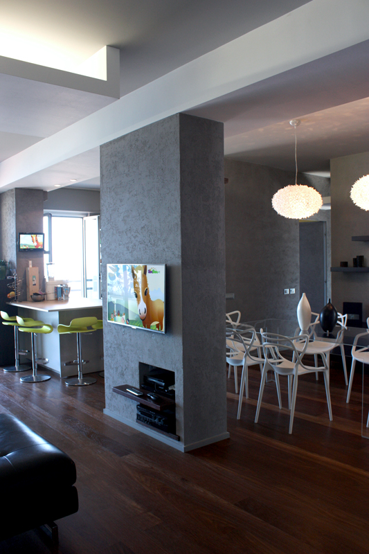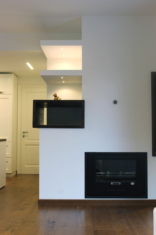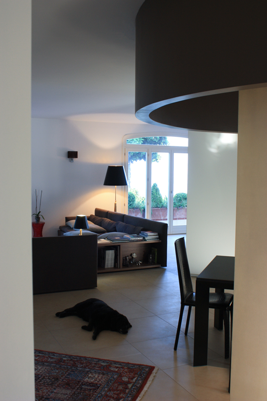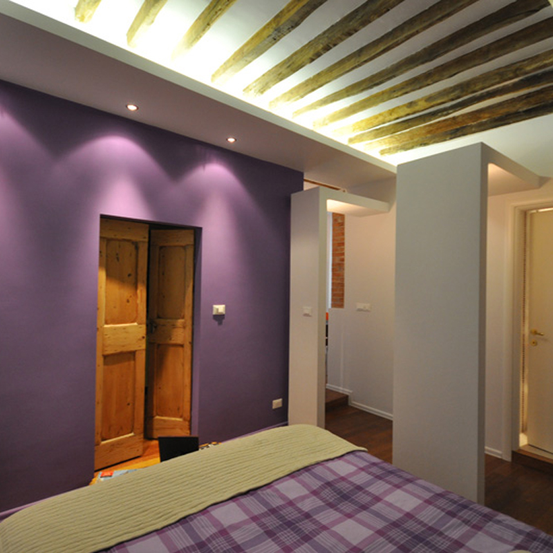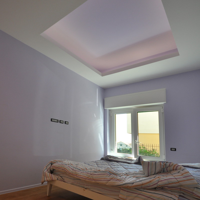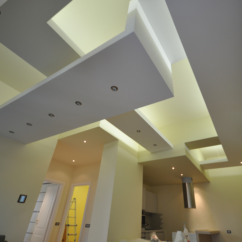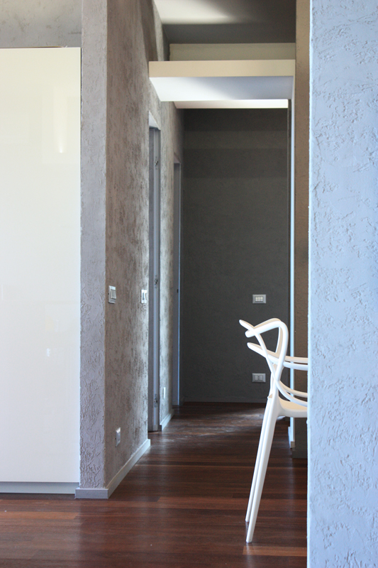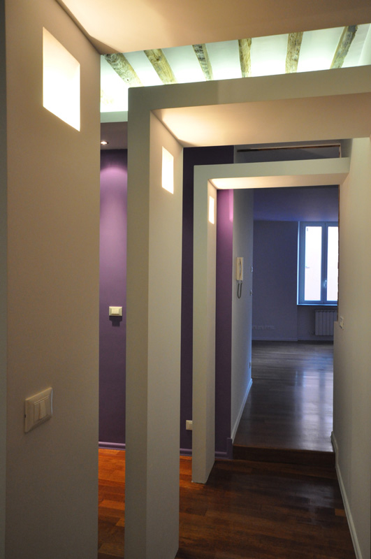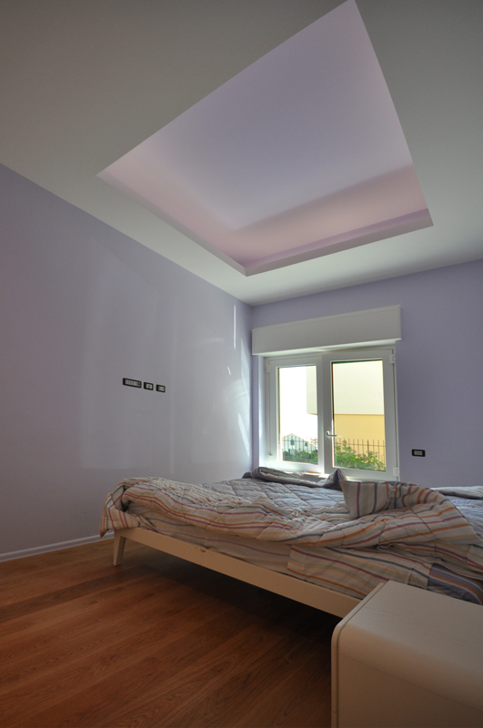 Un’abitazione di dimensioni ridotte si trasforma e trova un grande respiro nel sapiente gioco di elementi sovrapposti, ad altezze diverse, nei soffitti delle stanze. L’uso delle luci, oltre a quello dei colori morbidi e alternati, enfatizza il progetto e lo rende caldo, accogliente.