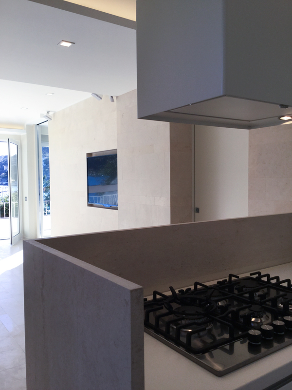 Una casa per le vacanze affacciata sul mare, luminosa e contemporanea. I giochi geometrici del progetto diventano elemento caratteristico degli ambienti. E il grande living interamente in marmo rosa arriva a integrare il modulo a isola per la cucina, nello stesso materiale.