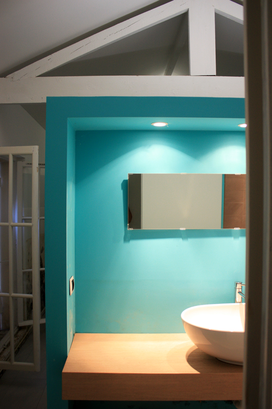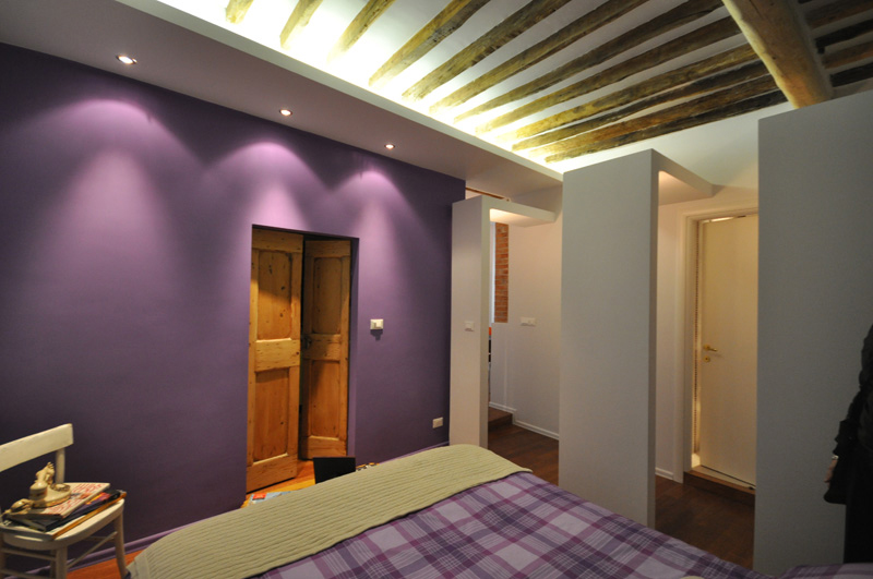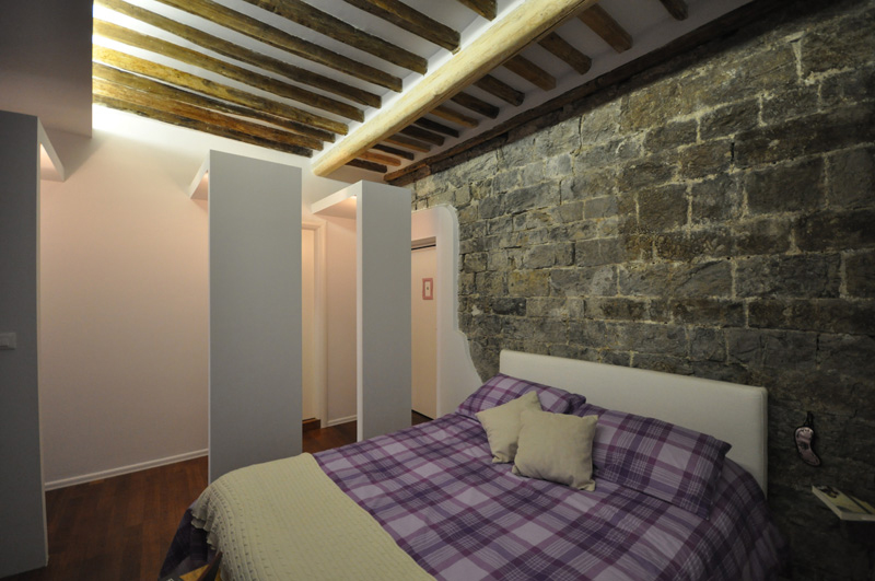 Il fascino del centro storico di Genova è evidenziato nella scelta di mantenere alcuni elementi originali, come i muri di pietra e le travi di legno. Un passaggio appena accennato con leggere strutture alternate e una parete colorata a contrasto, riportano l’abitazione all’epoca contemporanea.